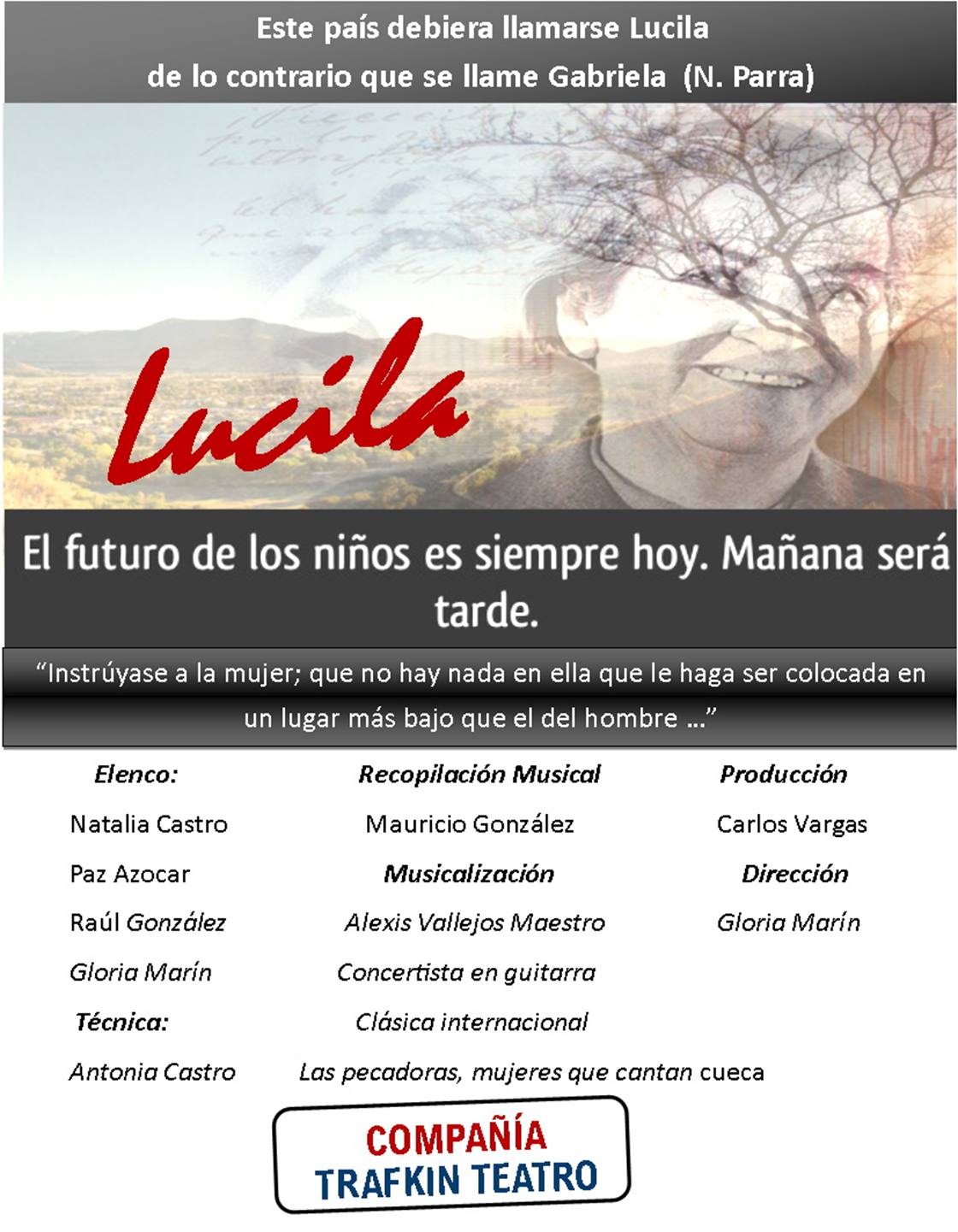 Nos enorgullece como departamento de lenguaje y comunicación de Enseñanza media el poder presentar la Obra LUCILA a todos los alumnos de la enseñanza media, enmarcado en este mes de octubre en el cual tendremos diferentes actividades culturales y artísticas para toda la comunidad. La obra tendrá una adhesión de $1000 pesos y podrán asistir todos los alumnos de enseñanza media con ropa de color.
